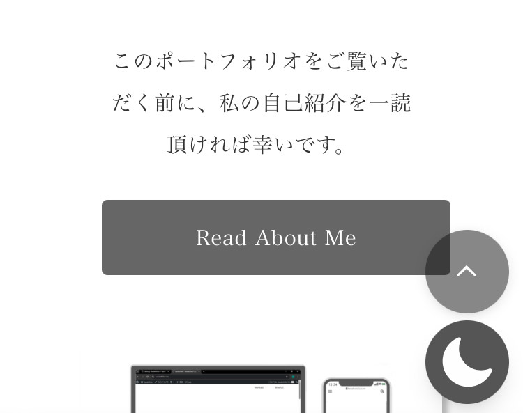 | ギミック | ・不要なギミックや機能を極力排除し、制作物紹介サイトとして必要最低限の仕様に留めることで、制作・管理の手間を削減。 ・PC版トップメニューでは、カーソルを置くと文字が大きくなる動きを加え、シンプルな中にも遊び心を演出。(CSSによる実装のため、コード管理も容易) ・ダークモード切替ボタンを設置。個人的な経験から、目の負担を軽減できる利便性を重視。ワンクリックでON/OFFを切り替え可能。 |