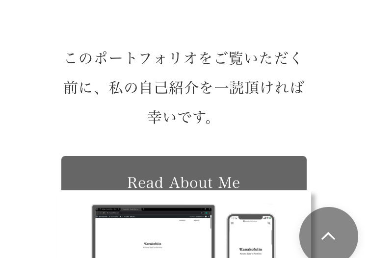 const about_me_cta = document.querySelector('.site_title').insertAdjacentHTML('afterend', '<div class="about_me"><p>このポートフォリオをご覧いただく前に、私の自己紹介を一読頂ければ幸いです。</p><a href="http://kanakofolio.net/?page_id=14" class="about_me_cta">Read About Me</a></div>');JavaScriptのinsertAdjacentHTMLで導線ボタンのHTMLを挿入