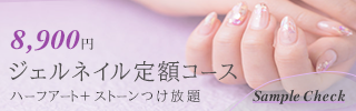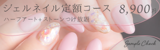 | テキスト | ジェルネイル定額コース ハーフアート+ストーンつけ放題 8,900円 サンプルを見てみる(Sample check) |