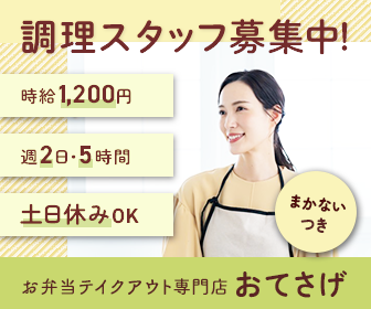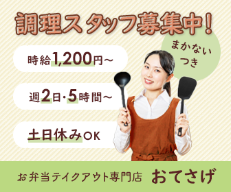 | テキスト | お弁当のテイクアウト専門店:おてさげ 調理スタッフ募集中 土日休みOK 週2・5時間〜 まかない有り |