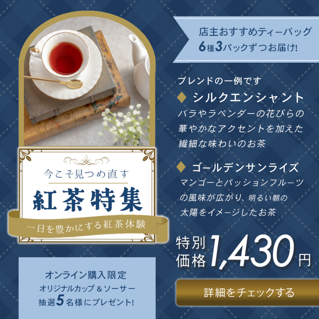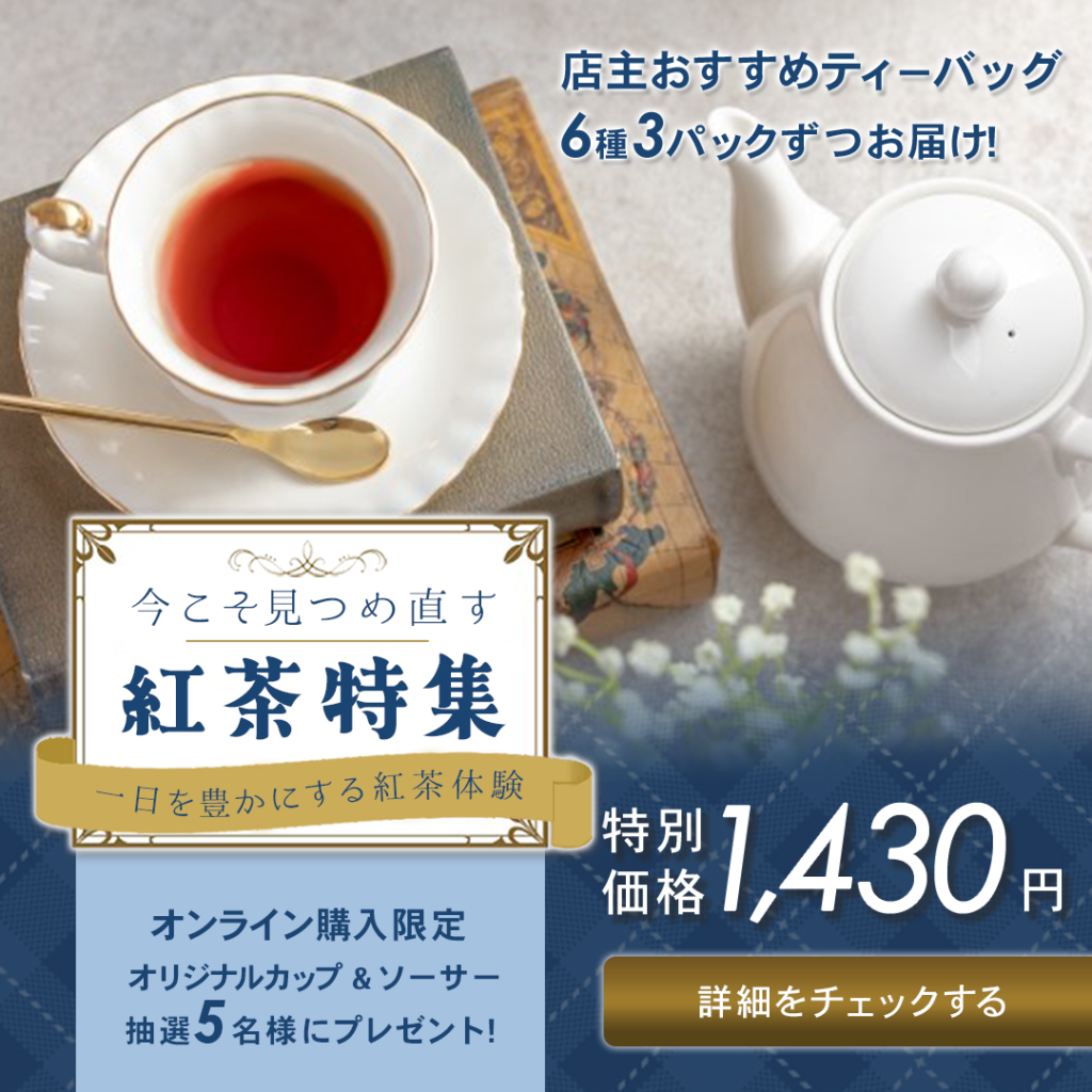 | 記載内容 | 特集名: 今こそ見つめ直す、紅茶特集 コピー: あなたの一日を豊かにする紅茶体験 商品: 店主おすすめのティーバック6種類を3パックずつお届けします。 今だけ特別価格!1,430円。 オンラインストアでご購入いただいた方の中から抽選で5名に、当店オリジナルカップ&ソーサーをプレゼント |