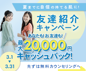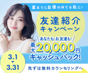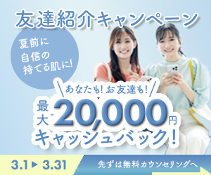 | テキスト | 友だち紹介キャンペーン あなたもお友だちも最大20,000円キャッシュバック 夏前に自信の肌へ! まずは無料カウンセリングから 対象期間:3月1日〜3月31日 |
