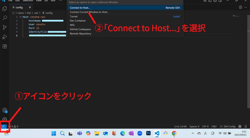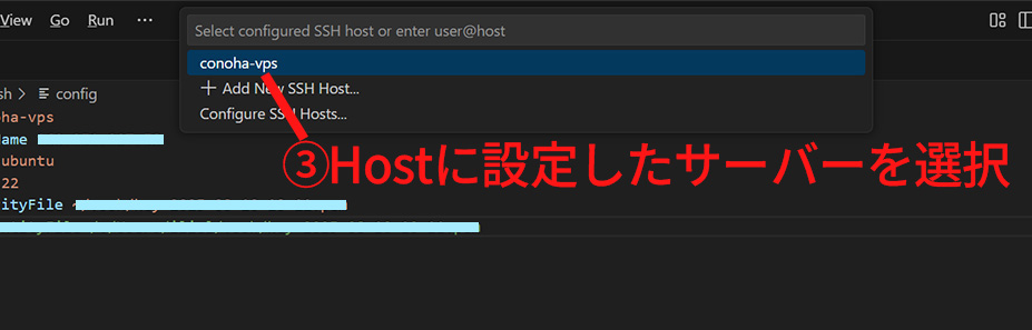 設定以降は、エディタの左下の青色で囲われているアイコン(>と<を上下につなげたような記号)をクリックし、上部中央のスペースの下に出現するメニュー内の「Connect to Host…」からconfigファイルで設定したサーバーに接続可能。